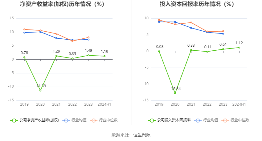 数据显示,2024年上半年公司加权平均净资产收益率为1.19%,较上年同期下降0.17个百分点;公司2024年上半年投入资本回报率为1.12%,较上年同期增长0.60个百分点。