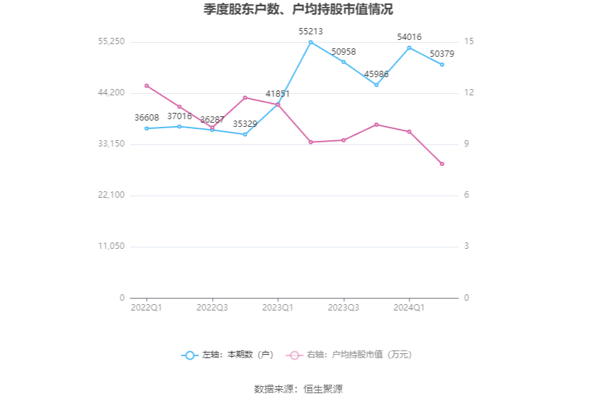 筹码集中度方面,截至2024年上半年末,公司股东总户数为5.04万户,较一季度末下降了3637户,降幅6.73%;户均持股市值由一季度末的9.75万元下降至7.86万元,降幅为19.38%。