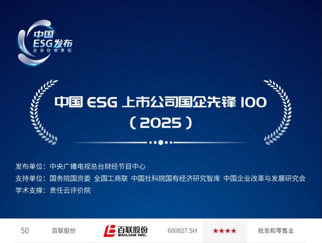 中央广播电视总台“中国ESG(企业社会责任)发布”重磅推出《2025年度ESG行动报告》,同步揭晓“中国ESG上市公司国企先锋100(2025)”榜单。 百联股份 成功入选“中国ESG上市公司国企先锋100(2025)”并位列第50名。
