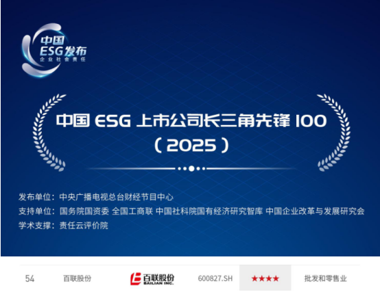 中央广播电视总台《长三角ESG行动报告(2025)》在“第二届ESG中国·长三角企业社会责任发布会”上正式发布。 百联股份 成功入选“中国ESG上市公司长三角先锋100(2025)”并位列第54名。