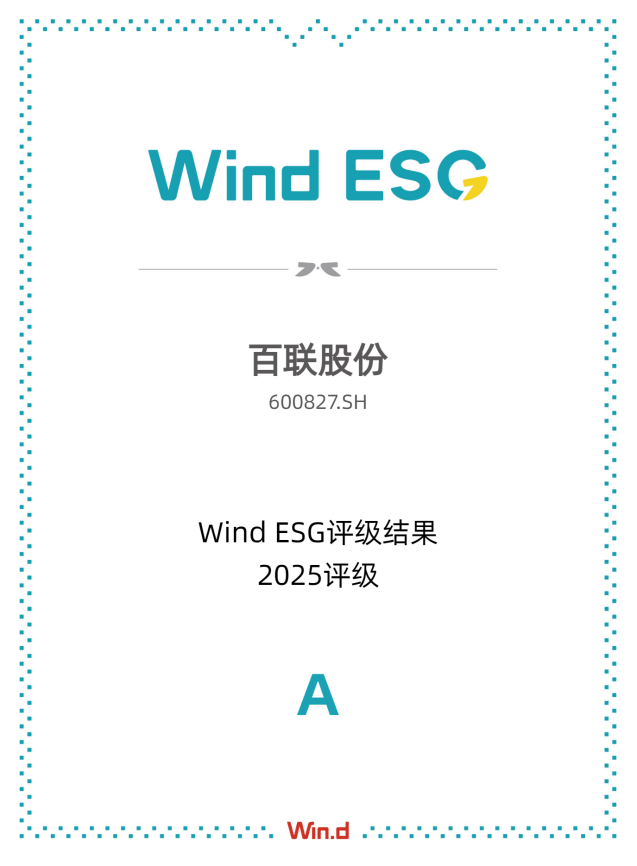 在 万得 ( Wind )2025ESG评级中, 百联股份 从BBB级跃升至A级,标志着公司ESG发展实力跨越提升。