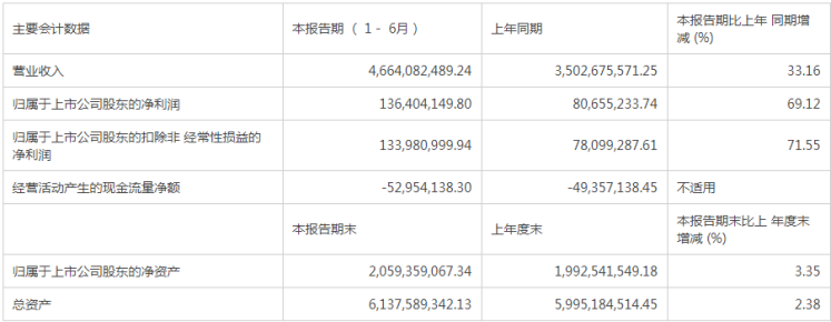 8月7日,人民同泰发布了2020年半年度业绩报告,今年上半年,该公司实现营业收入46.6亿元元,同比增长33.16%;归属于上市公司股东的扣非前和扣非后净利润分别为1.34亿元和1.36亿元,同比分别增长了69.12%和71.55%;报告期内,该公司经营活动产生的现金流量净额为-5295万元,归属于上市公司股东的净资产20.6亿元。