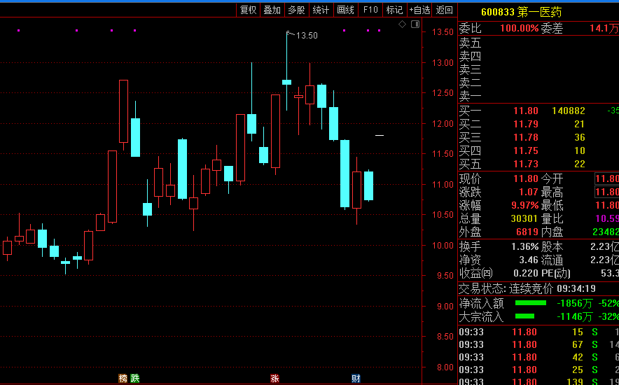 4月8日早盘,第一医药开盘一字板涨停。截至发稿报11.80元,涨停板封单14万手。