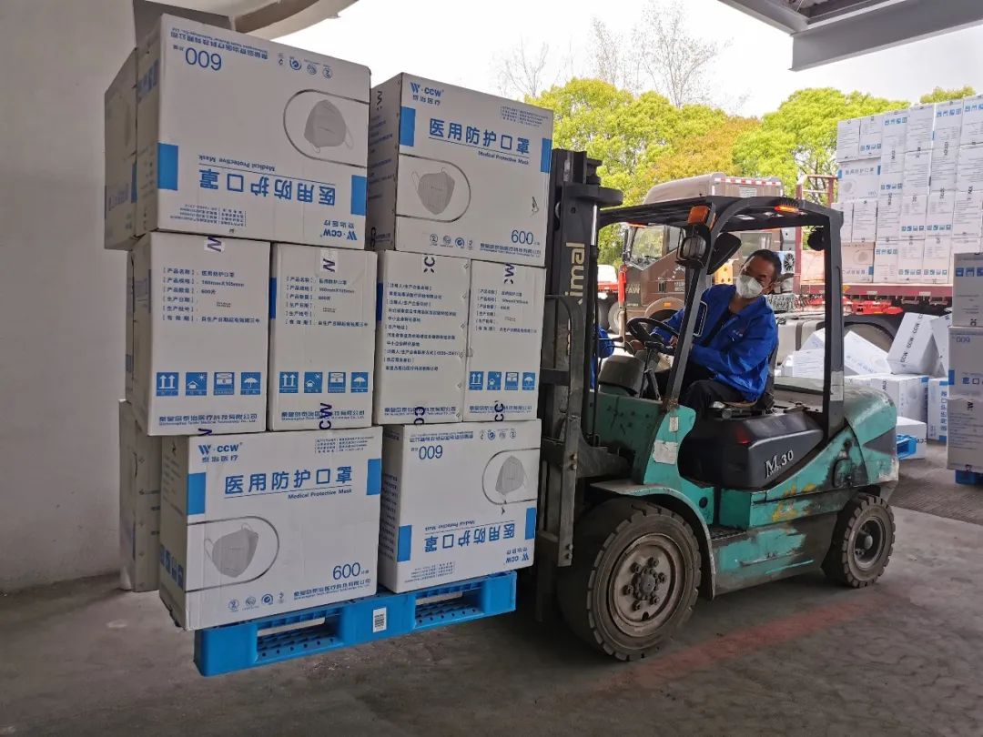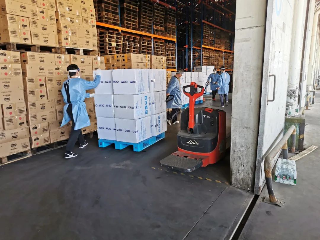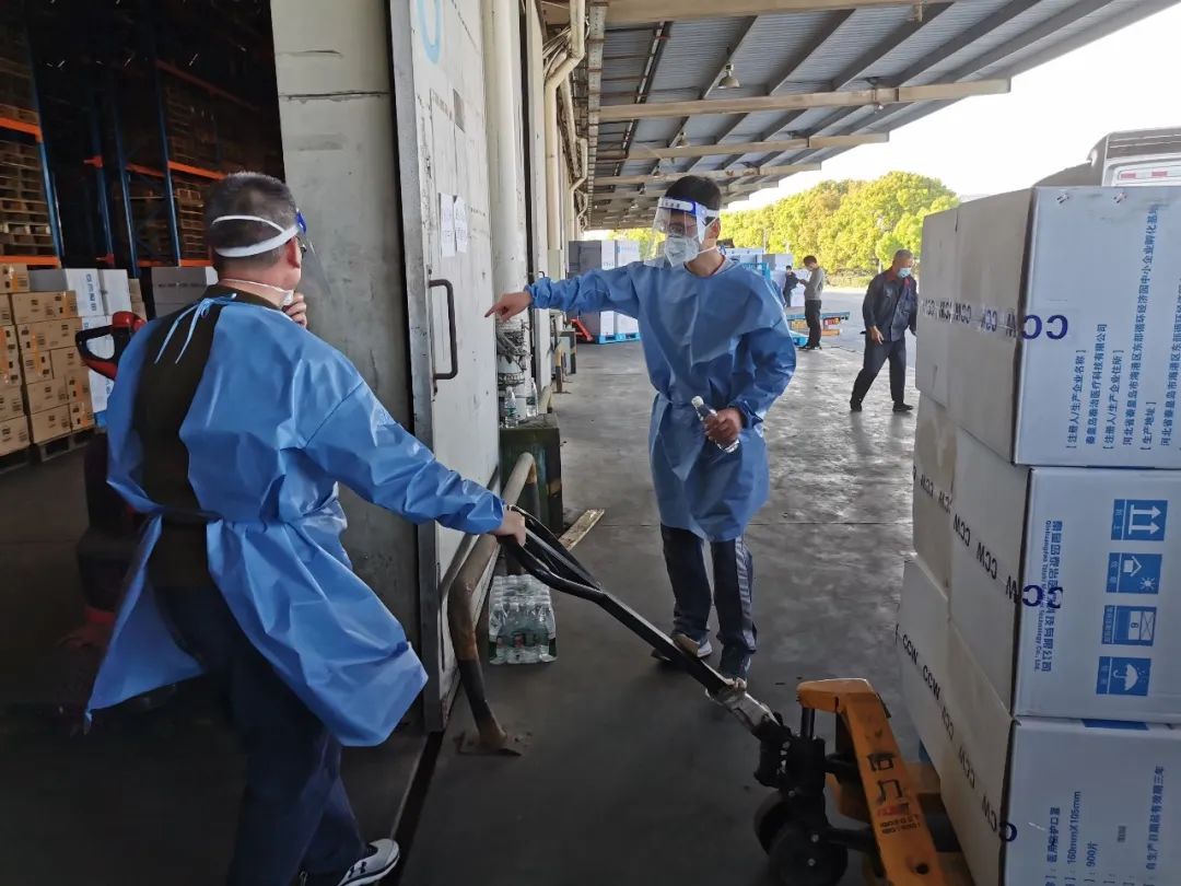 4月8日当天由于支援人员有限,2位同志从上午9点一直忙到晚上11点。作为叉车工的朱伟庆、孙炯2位同志持证上岗,在报关员的指挥下负责把防疫物资从货车内取出或者把货品装入货车内。取出的防疫物资也在报关员的安排下,找到合适的储位。该距离一般在50m左右,一车大约400箱防疫物资,每人每天要完成10车左右的工作量。4月10日中午,孙炯结束了在第一医药物流仓库的志愿工作,被安排前往上海市救灾物资储备库支援,朱伟庆依然坚守在仓库。