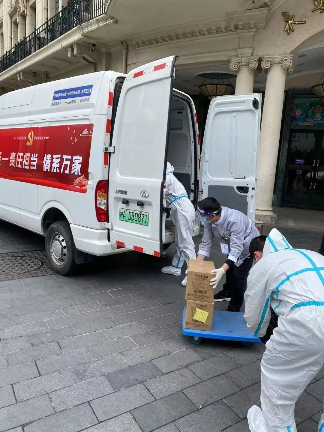第一批防护物资运抵百联汽车共和新路3550号园区,清点完毕后,即按车辆和人员进行分装。