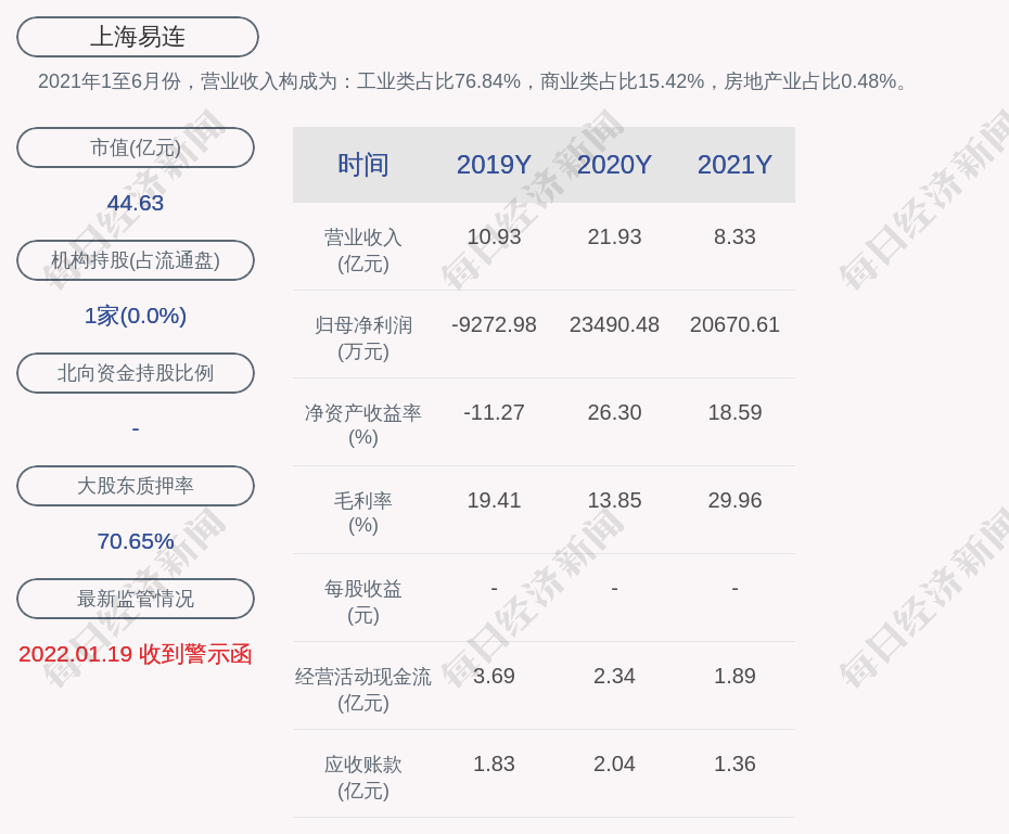 2021年1至6月份,上海易连的营业收入构成为:工业类占比76.84%,商业类占比15.42%,房地产业占比0.48%。