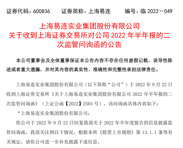 9月22日晚间,在上海易连(600836)披露有关半年报问询函的回复后不久,上交所的二次问询函接踵而至。