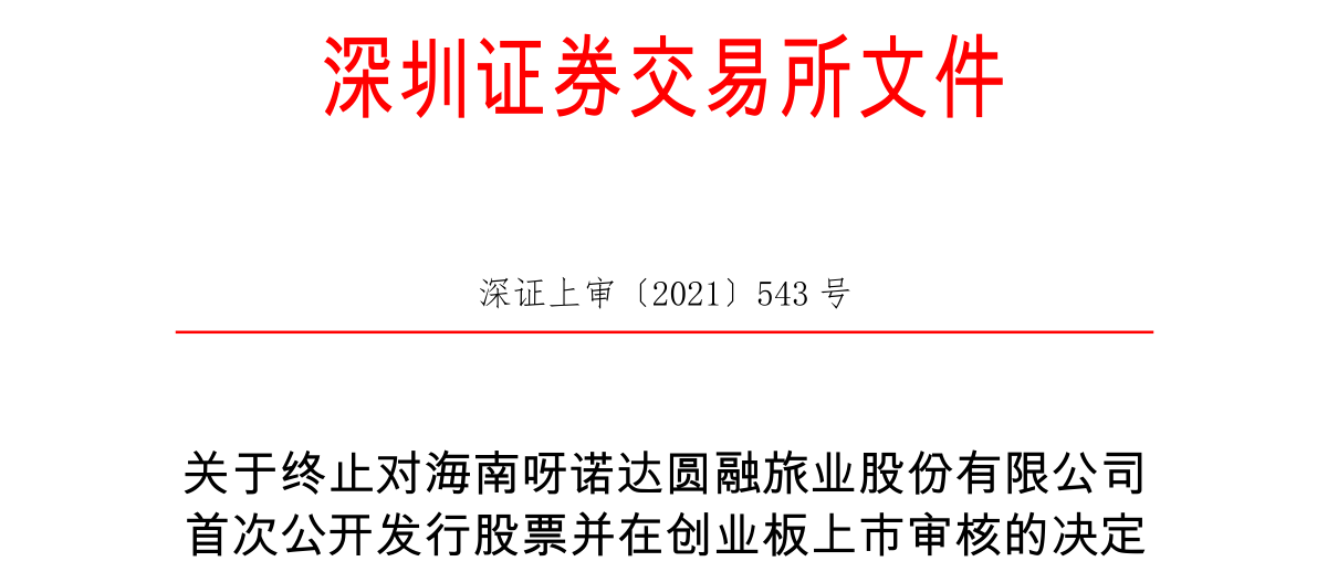 2021年12月22日,呀诺达向深交所提交了《关于撤回海南呀诺达圆融旅业股份有限公司首次公开发行股票并在创业板上市申请文件的申请》,保荐人向深交所提交了《海通证券关于撤回海南呀诺达圆融旅业股份有限公司首次公开发行股票并在创业板上市申请文件的申请》。根据《深圳证券交易所创业板股票发行上市审核-1-规则》第六十七条的有关规定,深交所决定终止对公司首次公开发行股票并在创业板上市的审核。