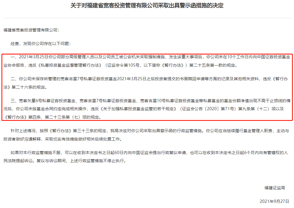 2021年9月27日,宽客投资被福建证监局采取出具警示函的监管措施。原因包括三项违规: