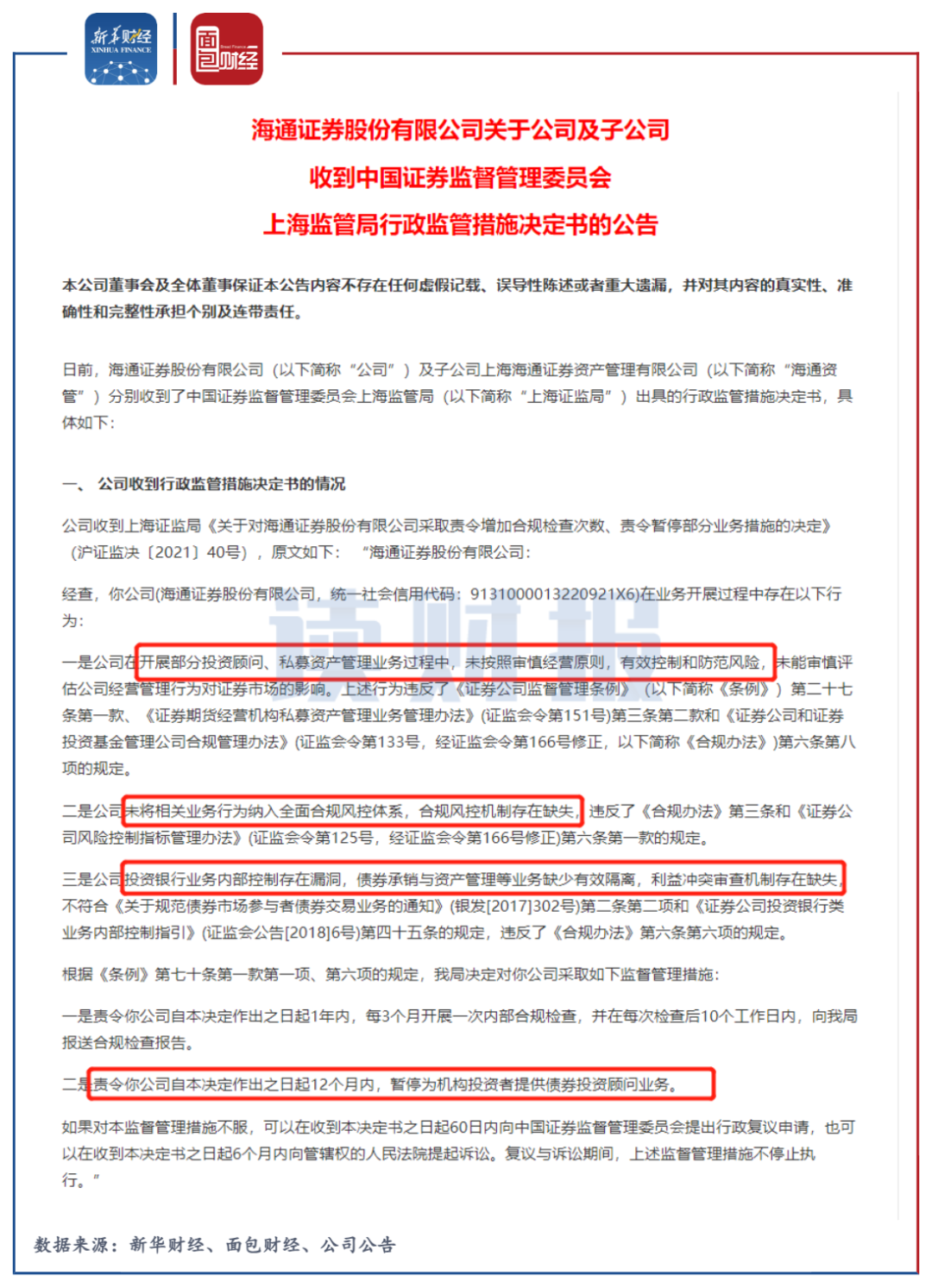在资管业务方面,2021年3月,海通证券收到证监会上海监管局的行政监管措施决定书,因为合规和风控漏洞,监管部门做出“12个月内,暂停为机构投资者提供债券投资顾问业务”的处罚决定。