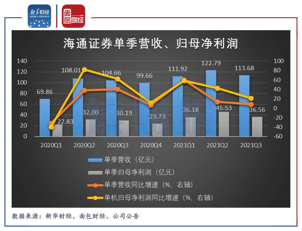 但是,2021年第三季度,海通证券的单季营收与净利润同比增速显著下滑。财报显示,2021年第三季度,海通证券营业收入和归母净利润增速分别仅为8.62%和21.1%,较上半年明显下降。