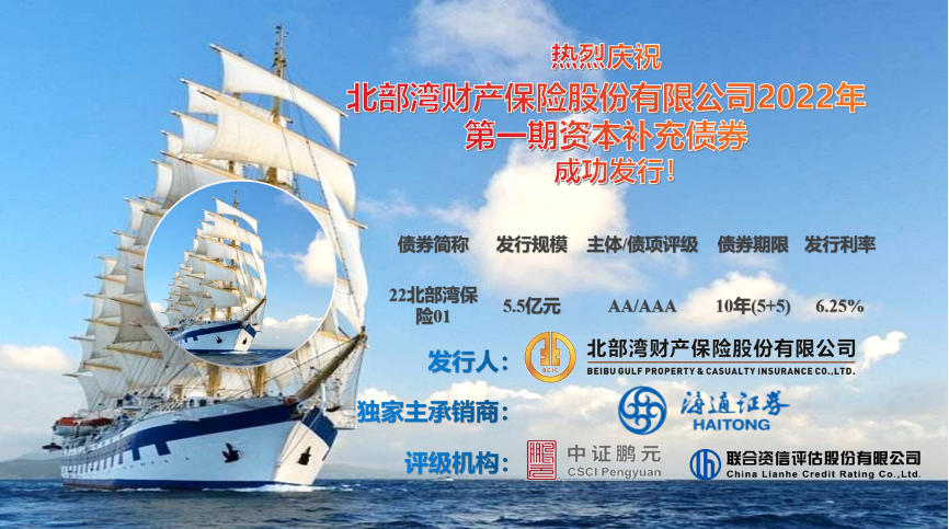 近日,海通证券助力北部湾财产保险股份有限公司(以下简称北部湾保险)成功发行“北部湾财产保险股份有限公司2022年第一期资本补充债券”,圆满落地西部地区首单保险公司资本补充债券批文项下全部债券发行。