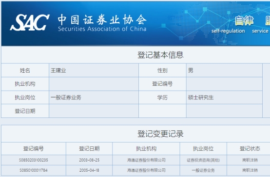 中证协网站显示,王建业在海通证券股份有限公司登记的执业岗位为证券投资咨询(其他)、一般证券业务,登记状态为离职注销。