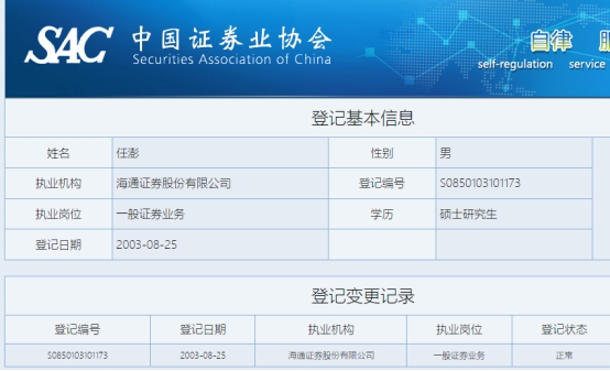 公开资料显示,任澎现任海通证券副总经理,任职从2007年至今,并于2019年6月18日起担任公司执行董事。中证协网站显示,任澎于2003年8月25日在海通证券股份有限公司登记的执业岗位为一般证券业务,登记状态为正常。