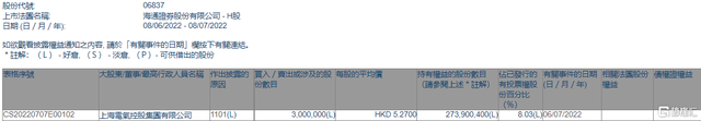 根据联交所最新权益披露资料显示,2022年7月6日,海通证券(06837.HK)获上海电气控股集团有限公司在场内以每股均价5.27港元增持300万股,涉资约1581万港元。