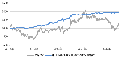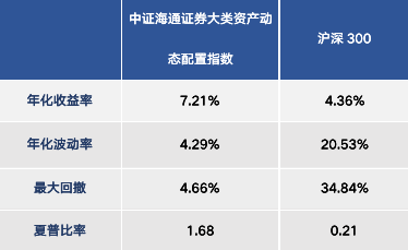 中证海通证券大类资产动态配置指数选取权益类资产、债券类资产以及商品类资产作为指数样本,反映国内大类资产市场的整体表现。该指数在均值-方差模型的基础上,采用风险平价模型的方法,结合信号处理技术对模型进行动态降噪优化。指数自基日以来,表现出稳健性和前瞻性。从基日2017年12月29日至2022年7月1日期间,中证海通证券大类资产动态配置指数年化收益率达到7.21%,同时年化波动率和最大回撤率分别仅为4.29%和4.66%,净值曲线走势平稳。沪深300指数在该期间年化收益率约为4.36%,年化波动率和最大回撤率分别为20.53%和34.84%。