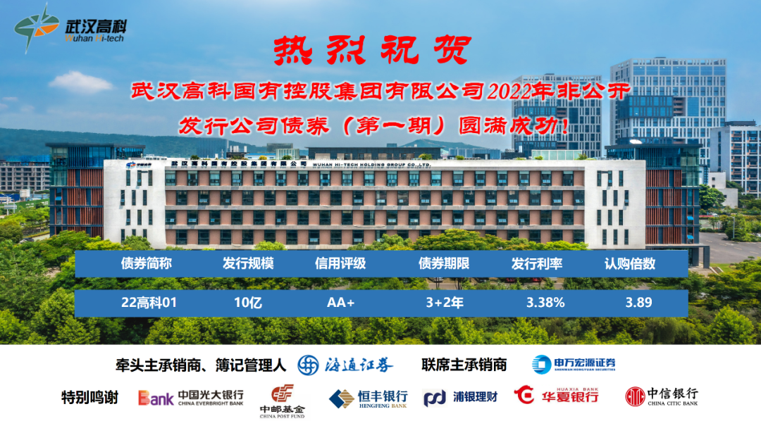 7月13日,海通证券牵头主承销的武汉高科国有控股集团有限公司(以下简称武汉高科)2022年第一期非公开发行公司债券成功发行,发行规模10亿元,期限3+2年期,票面利率3.38%,全场认购倍数3.89倍。