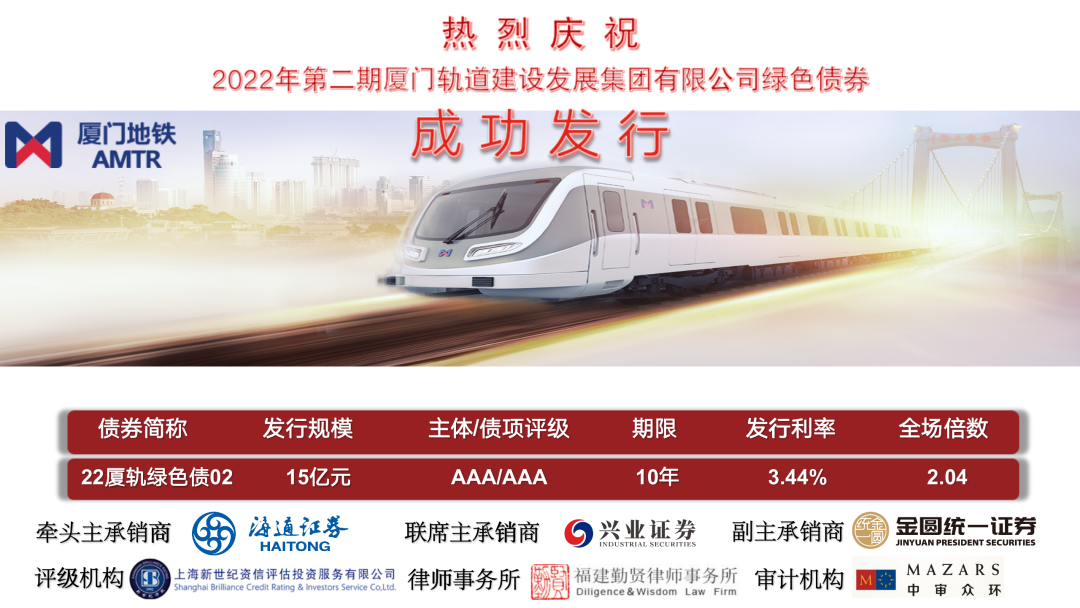 10月25日、27日,海通证券作为牵头主承销商助力厦门轨道建设发展集团有限公司(以下简称厦门轨道集团)成功发行2022年两期绿色债券,22厦轨绿色债02和22厦轨绿色债03。22厦轨绿色债02发行规模15亿元,期限10年,票面利率3.44%。22厦轨绿色债03发行规模15亿元,期限5年,票面利率2.95%。以上债券的成功发行,将为厦门市轨道交通建设注入资金活水,为厦门市绿色发展、落实低碳省市试点工作添一抹“新绿”。