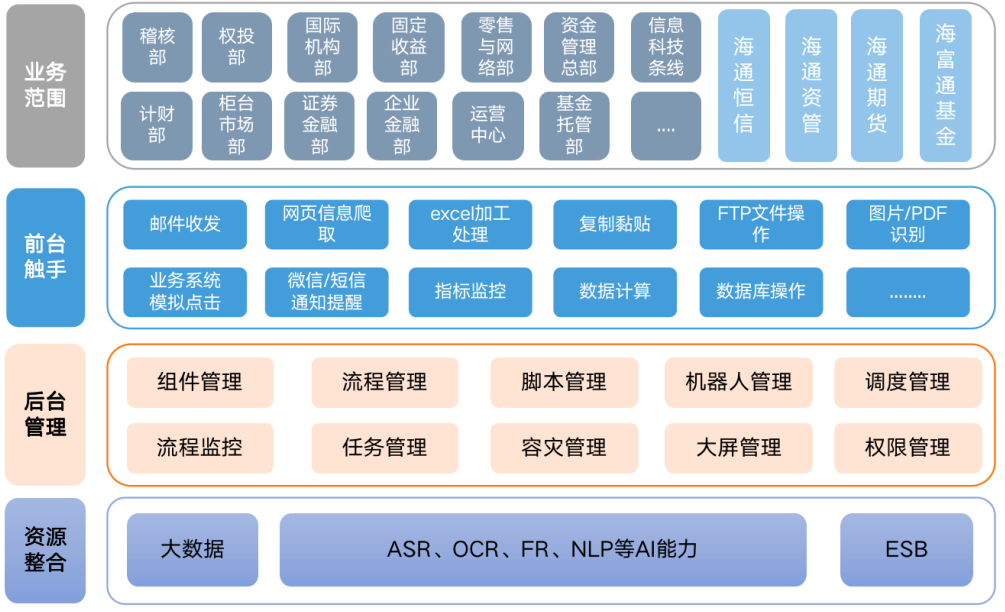 海通证券数字员工平台结合业务需求首创FF场景遴选模型,提出自动化流程场景规范,形成业务和技术紧密合作的新工作模式,截止2022年9月已有490余个业务流程,应用在20余个业务部门,实现降本增效。在技术创新方面,将场景原子组件化,对外编排服务化,实现了流程实时接口触发,结合AI、OCR、ASR等多种技术实现流程端到端改造,助力业务流程智能化。在场景推广方面,积极打造了各类业务处理机器人、防疫机器人、微信对话机器人等并建立了RPA机器人商城,同时形成了较为成熟的数字员工运营治理体系,加速推动企业数字化转型。在行业生态方面,积极参与信通院、金标委等RPA行业相关标准制定与编写,行业首家通过信通院全能力成熟度测评,并荣获多项行业金融科技创新大奖,引领行业金融科技发展的新风向。