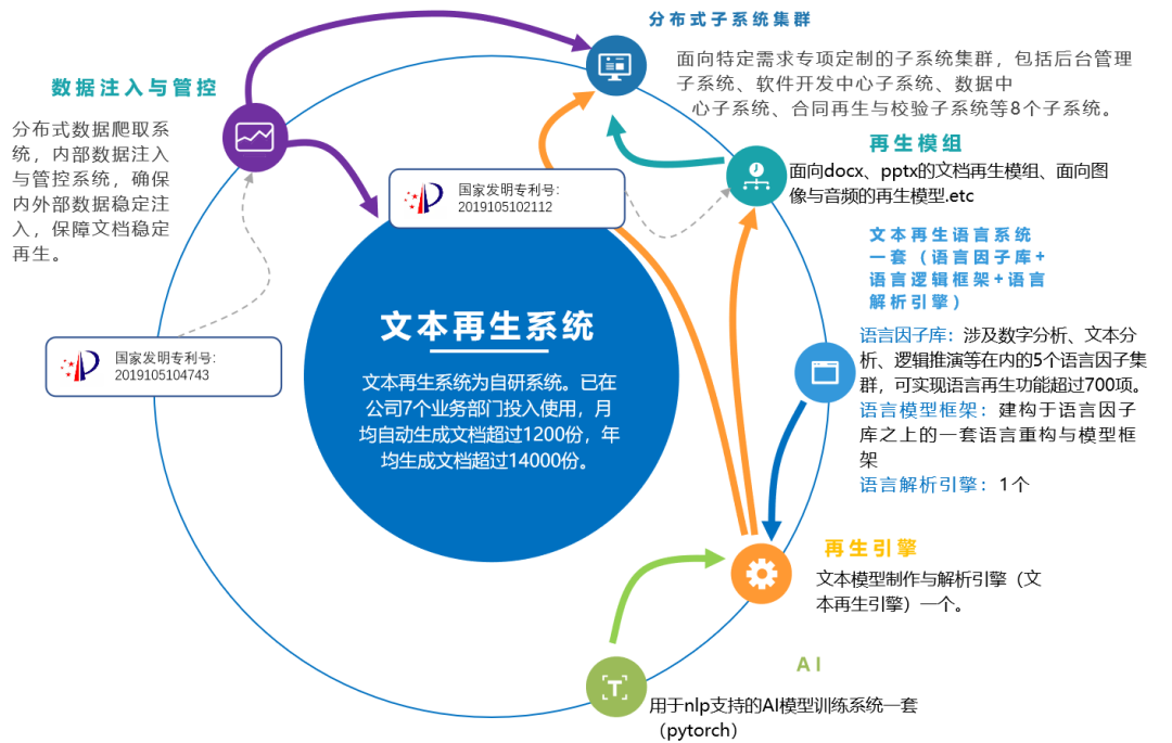 证券业智能文本再生平台为海通自主研发的智能写作平台。可将一份需要至少半天到1天撰写的复杂文档在数分钟内全自动再生,再生内容覆盖度可达100%,与真人撰写相似度接近95%以上。再生平台融入国家发明专利两项,由一个智能分析处理中心+多个专业领域子系统构成。自研的再生语言系统与语言解析引擎经过多年的完善,可完整重现绝大部分的常态思维逻辑,将思维逻辑固化入知识模型之中,实现各类分析处理的自动化再现,完成高精度复杂文档的自动再生,文本再生能力在当前处于领先地位。为海通7个业务部门提供服务,孵化出移动端智能撰写机器人(数据君)、合同再生子系统,企业经营情况分析子系统等深度应用场景,年自动再生文档超过1万4千份。