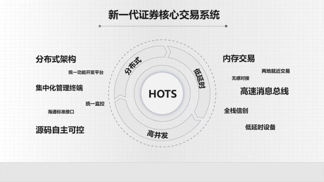 海通证券基于信创技术平台打造新一代分布式核心交易系统(简称HOTS),将传统集中式交易系统化繁为简,将分布式架构应用于证券交易业务,实现支持普通交易和信用交易的高并发、低延迟、易扩展的证券核心交易系统,并完成基于信创平台的全栈适配改造,标志着海通证券公司在核心交易系统成功实现“全自主可控”。HOTS系统一方面显著提高了海通证券服务经纪业务客户的能力,大幅提升交易业务效率;另一方面,全栈信创的新一代交易平台架构,对于未来证券行业的发展有重要的借鉴与引领意义,探索出核心系统建设的自研之路,推动了信创产业在证券行业核心交易领域的磨合发展,为践行金融科技发展和数字化转型提供坚实的技术基础和有力的发展保障。