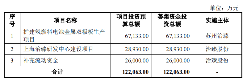 治臻股份原拟在上交所科创板公开发行股票不超过1,070.0000万股,且不低于发行后总股本的25%。公司原拟募集资金122,063.00万元,用于扩建氢燃料电池金属双极板生产项、上海治臻研发中心建设项目、补充流动资金。