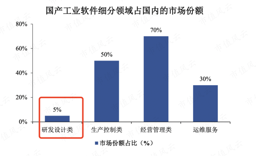 经营管理类和生产控制类的国产率已经高达70%和50%,但研发设计类的软件仅5%。