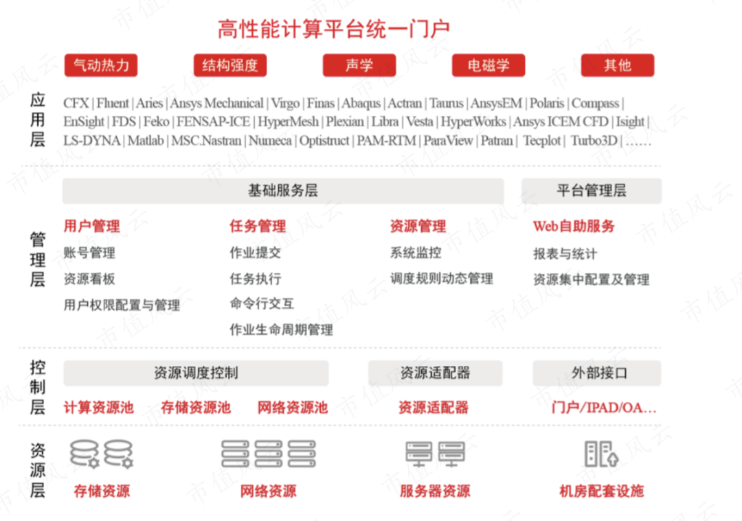 仿真产品开发则以高性能计算平台为例说明,包括应用、管理、控制、资源等层次,因为客户在生产制造过程中需要大量的仿真模拟计算,对算力的要求非常高。