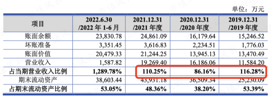 索辰科技2019年-2021年应收账款账面价值分别为1.35亿、1.39亿、2.12亿,与当期营业收入比值分别为116.28%、86.16%、110.25%。