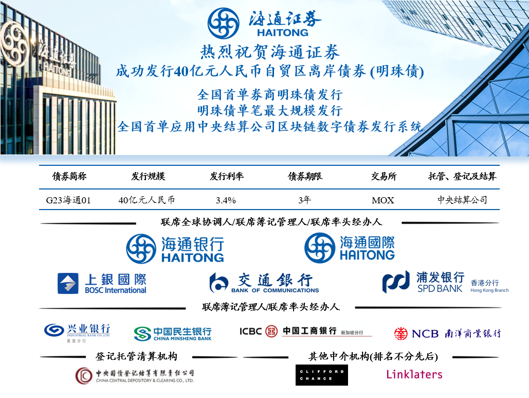 近日,海通证券成功发行全国首单券商上海自贸区离岸债券(明珠债),发行规模40亿元,期限3年,发行利率3.4%,由海通银行、海通国际等担任联席全球协调人,通过集团跨境业务联动,助力公司拓展融资渠道、降低融资成本、创新融资品种、优化负债结构。