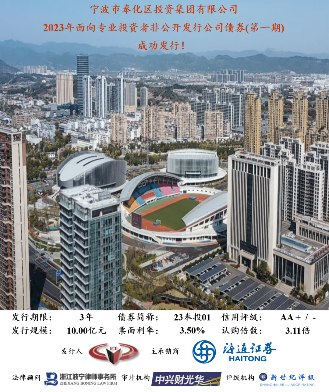 近日,海通证券作为独家主承销商及簿记管理人,助力宁波市奉化区投资集团有限公司(以下简称奉化区投)成功发行2023年面向专业机构投资者非公开发行公司债券(第一期)。本期债券发行规模10亿元,期限3年,票面利率3.50%。