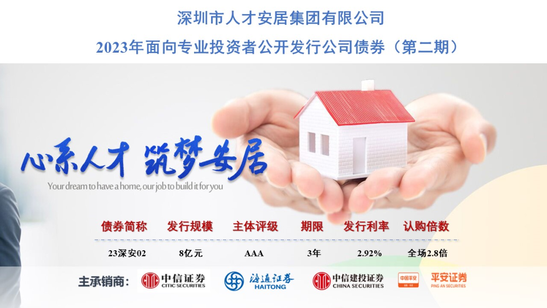近日,由海通证券主承销的深圳市人才安居集团有限公司(以下简称人才安居集团)2023年面向专业投资者公开发行公司债券(第二期)成功发行,发行规模8亿元,期限3年,票面利率2.92%。此次发行获得全市场投资人踊跃认购,认购倍数达2.8倍,体现了投资人对人才安居集团的认可,以及对大湾区保障性租赁住房市场的高度关注。