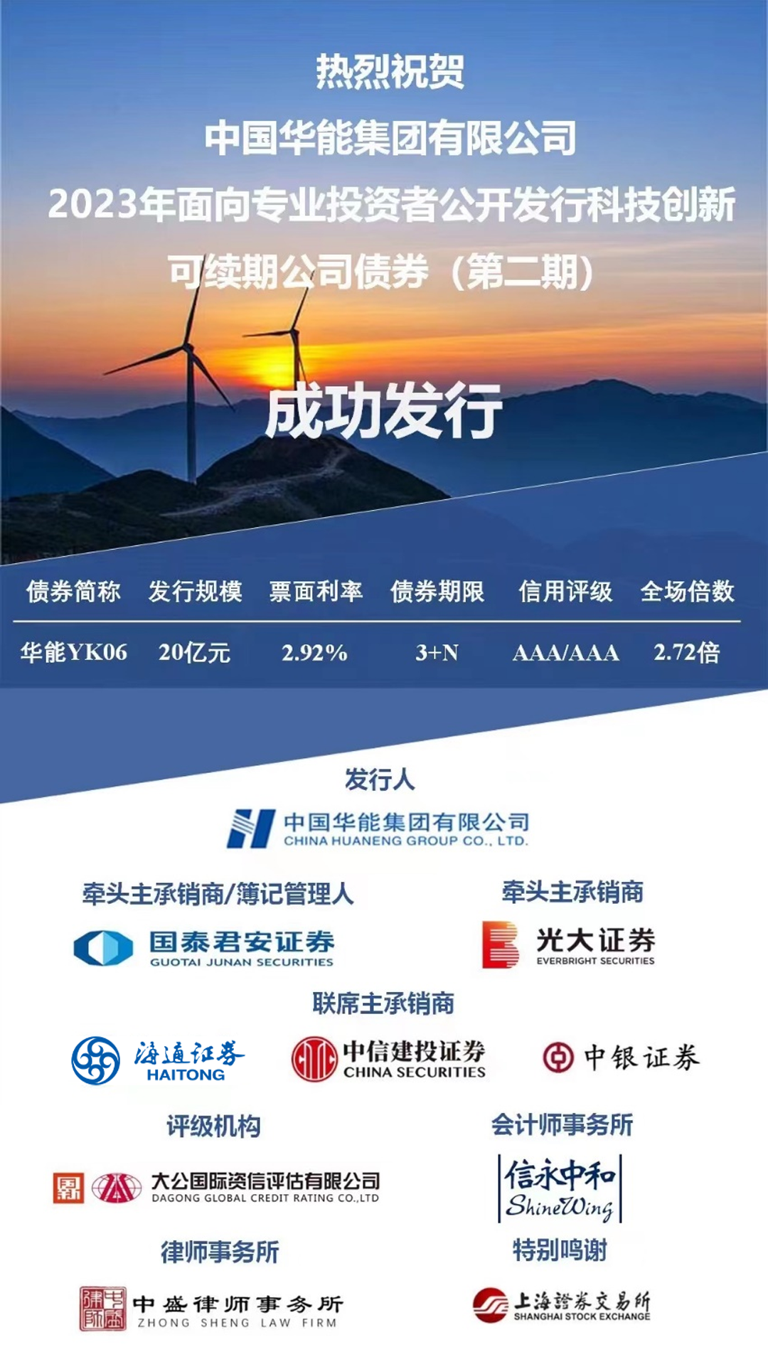 近日,海通证券作为主承销商,助力中国华能集团有限公司(以下简称中国华能)成功发行科技创新可续期公司债券——华能YK06,发行规模20亿元,债券期限3+N,票面利率2.92%。此次发行获得全市场投资人踊跃认购,簿记当天投资认购达2.72倍,体现了资本市场对中国华能的高度认可,以及对中央企业科技创新债券的广泛关注。
