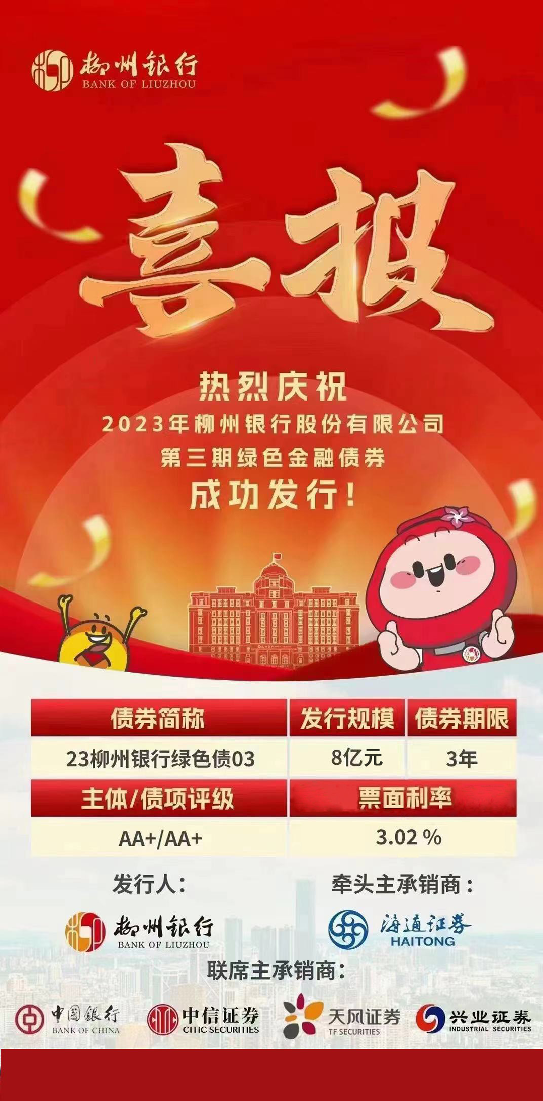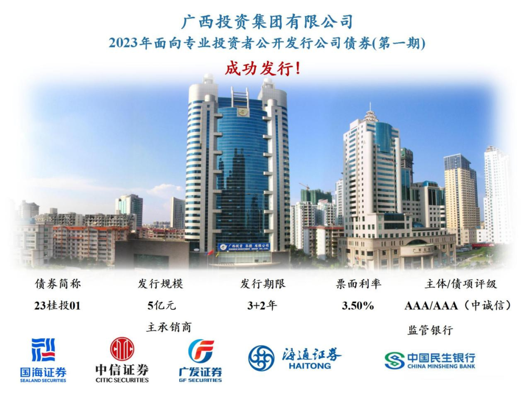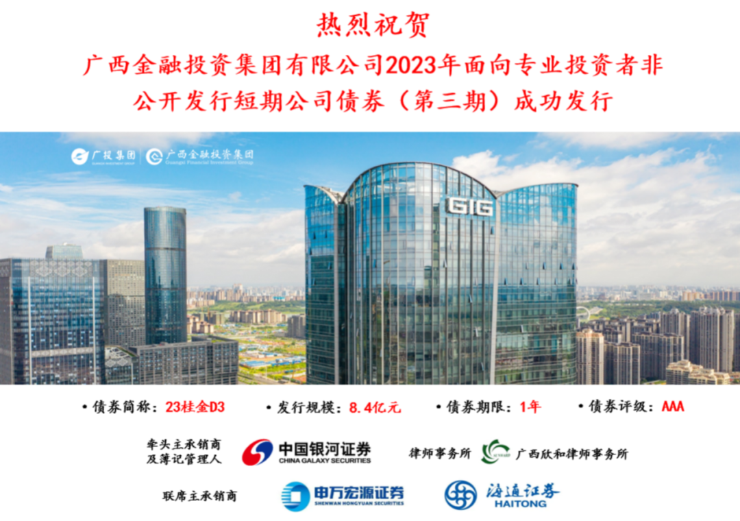 近日,海通证券作为主承销商,助力广西投资集团有限公司(以下简称广投集团)成功发行2023年面向专业投资者公开发行公司债券(第一期),发行规模5亿元,期限3+2年,票面利率3.50%;助力柳州银行股份有限公司(以下简称柳州银行)成功发行2023年第三期绿色金融债券,发行规模8亿元,期限3年,票面利率3.02%;助力广西金融投资集团有限公司(以下简称广西金投)成功发行2023年面向专业投资者非公开发行短期公司债券(第三期),发行规模8.4亿元,期限1年,票面利率5.50%。