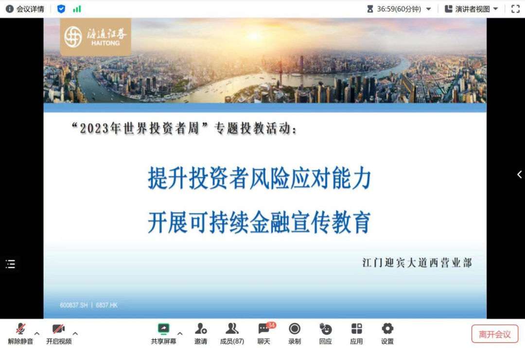 为落实监管部门关于开展“2023年世界投资者周”专题投教活动的工作要求,提升投资者风险管理能力,引导投资者关注可持续金融,海通证券围绕活动主题,组织开展“2023年世界投资者周”专题投教活动。