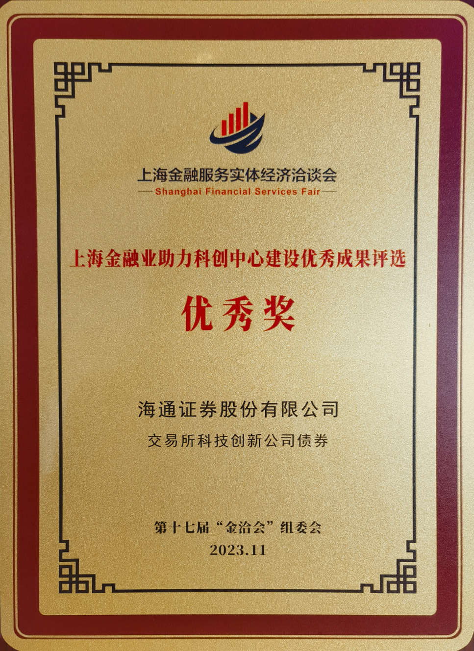 近日,2023年第十七届上海金融服务实体经济洽谈会以闭幕式暨科创金融大会的形式闭幕。会上揭晓了2023年上海金融业助力科创中心建设优秀成果评选结果,海通证券交易所科技创新公司债券荣获上海金融业助力科创中心建设优秀成果评选优秀奖。