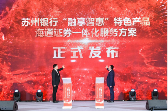 苏州银行党委委员薛辉、海通证券副总经理潘光韬共同发布苏州银行“融享智惠”特色产品及海通证券一体化服务方案。