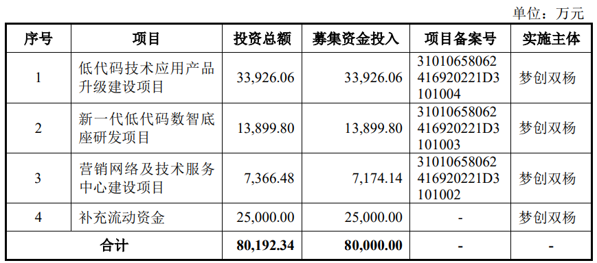 梦创双杨原拟在上交所主板公开发行股份数量不超过20,000,000股,且不低于发行后总股本的25%,不涉及原股东公开发售股份。公司原拟募集资金80,000.00万元,用于低代码技术应用产品升级建设项目、新一代低代码数智底座研发项目、营销网络及技术服务中心建设项目、补充流动资金。