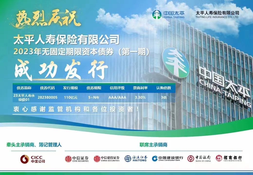 近日,海通证券作为联席主承销商助力太平人寿保险有限公司(以下简称太平人寿)成功发行2023年无固定期限资本债券(第一期),发行规模110亿元,票面利率3.30%,期限5+N年。本期债券是太平人寿首单无固定期限资本债券,是国内首批保险公司无固定期限资本债券,也是海通证券参与承销的首单保险公司永续债券,获得全市场投资人踊跃认购,认购倍数达3倍。