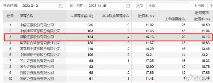 这样看来,“一查即撤”对于海通证券来说似乎已经属于“常规操作”了。据统计,今年来,海通证券保荐了92个IPO项目,在所有券商中排名第三,但其撤回率却是前三中最高的。值得注意的是,2023年一年,海通证券的撤否率高达16.13%,是2022年撤否率的2倍。