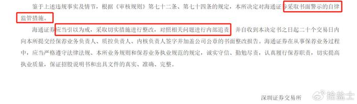对此,2024年1月,深交所下发监管函,认定海通证券在担任项目保荐人过程中,存在违规行为,因此告诫海通证券“引以为戒,采取切实措施进行整改”和“进行内部追责”。