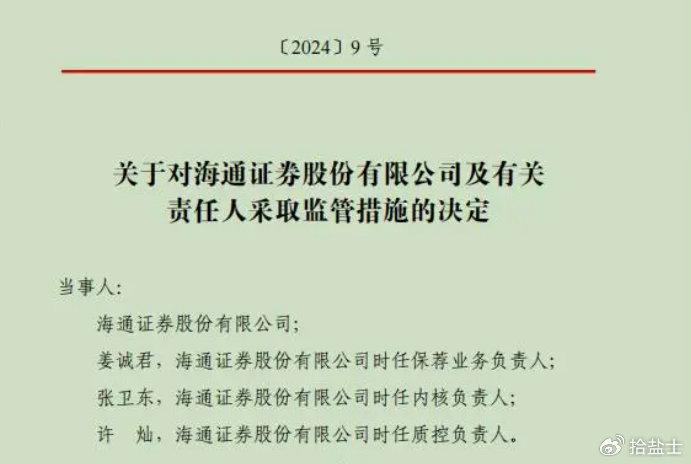 监管指出:“有关责任人对公司上述行为负有责任,未能审慎勤勉执业”。因此海通证券、时任保荐业务负责人姜诚君、时任内核负责人张卫东、时任质控负责人许灿同步被采取监管措施。