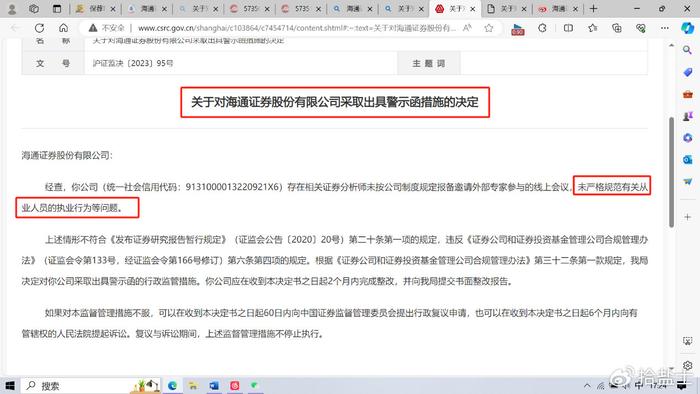 2023年6月,上海证券交易所发布《关于对海通证券股份有限公司予以监管警示的决定》,提出“海通证券作为河南惠强新能源材料科技股份有限公司、明峰医疗系统股份有限公司、上海治臻新能源股份有限公司申请首发上市项目的保荐人,存在对重要审核问询问题选择性漏答,对发行人的收入确认、存货、采购成本、资金流水和研发费用等核查不到位等违规情形”。
