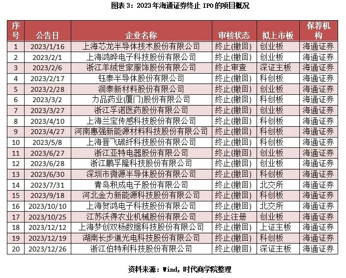 另外,按已完结IPO项目(指已发行和已终止项目)统计,2023年,海通证券保荐的IPO企业共有42家已完结。其中22家企业成功发行上市,20家企业终止IPO,保荐失败率(终止数量占比)为47.62%。