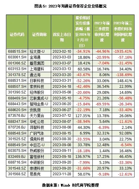 值得一提的是,海通证券于2023年成功保荐22家企业上市。截至2月22日,其中已有13家企业的股价跌破发行价,占比为59.09%;有6家企业在2023年前三季度营收同比下滑,占比为27.27%;有11家企业在2023年前三季度归母净利润同比下滑,占比为50%。
