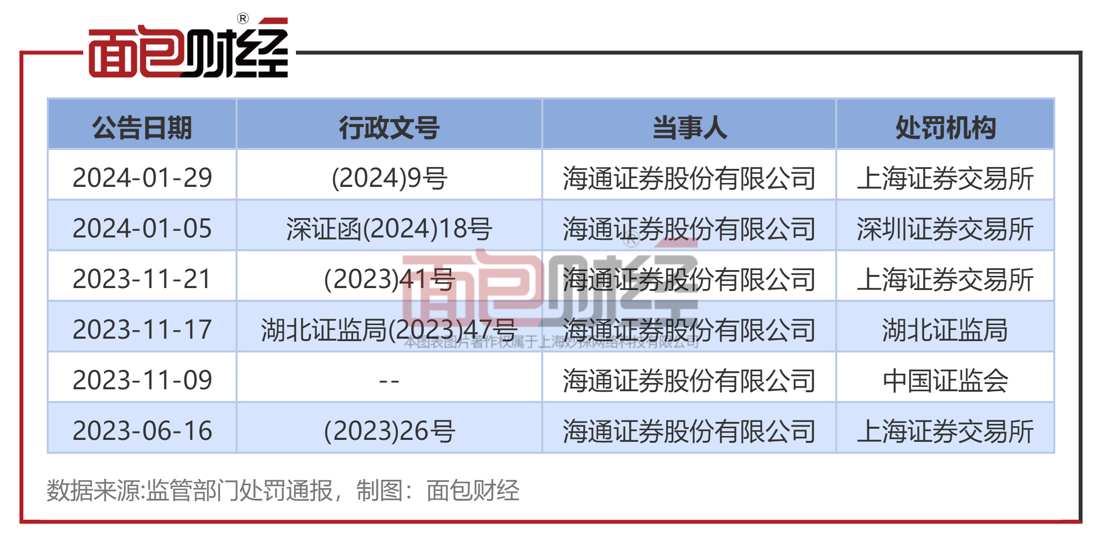 根据监管部门通报统计,2023年以来,海通证券因保荐业务违规被监管多次处罚。