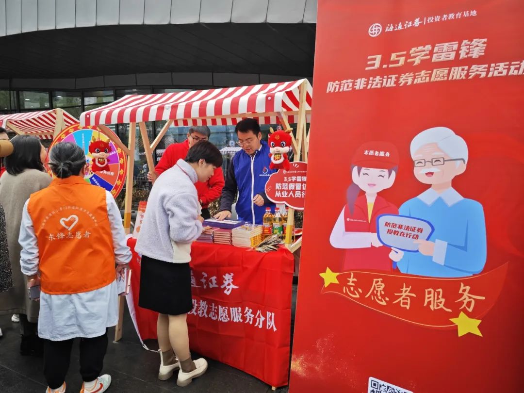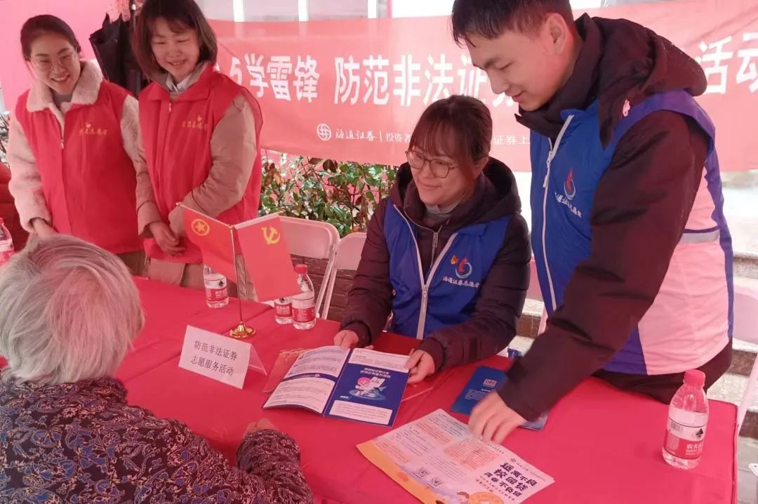 3月5日,海通证券“爱在海通”志愿服务总队携手旗下“防非先锋”投教志愿服务分队、“法治海通”普法志愿服务分队走进上海黄浦区小东门街道“金融品巷·零距离党群服务站”,开展“3·5”学雷锋为民志愿服务活动,为周边居民普及防范非法证券知识,提供普法宣传志愿服务,以实际行动践行新时代雷锋精神。