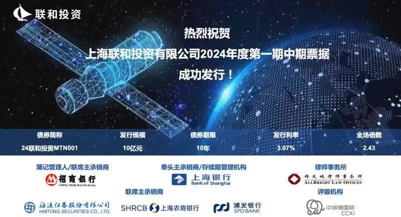 近日,海通证券作为联席主承销商,助力上海联和投资有限公司(以下简称上海联和投资)成功发行2024年度第一期中期票据,发行规模10亿元,期限10年,票面利率3.07%,全场认购倍数2.43倍。