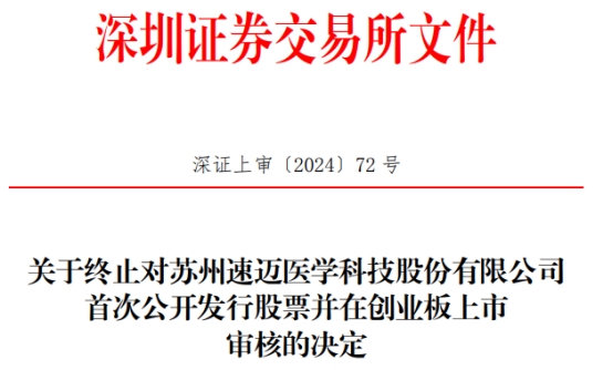 深交所网站日前公布关于终止对苏州速迈医学科技股份有限公司(以下简称“速迈医学”)首次公开发行股票并在创业板上市审核的决定。