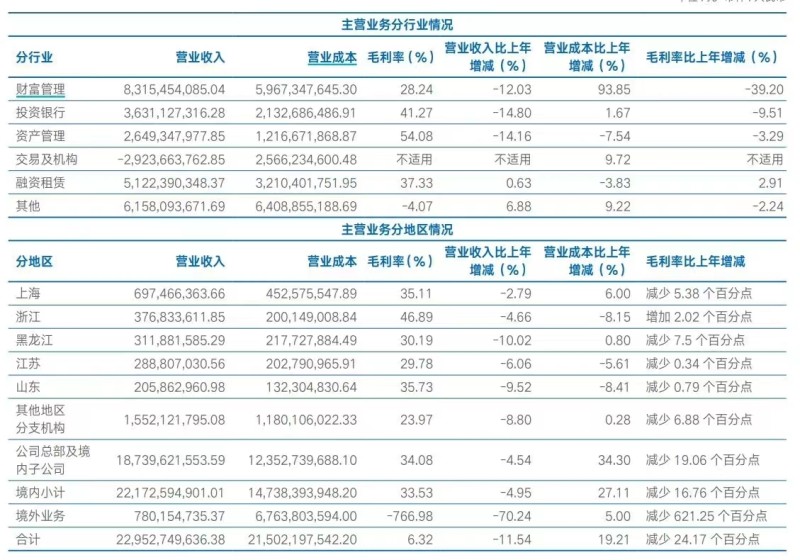 投资银行业务营收36.31亿元,营收降幅达14.8%,主要是因为境内外市场IPO融资金额同比下降,导致股权承销收入减少,毛利率降幅达9.51%。